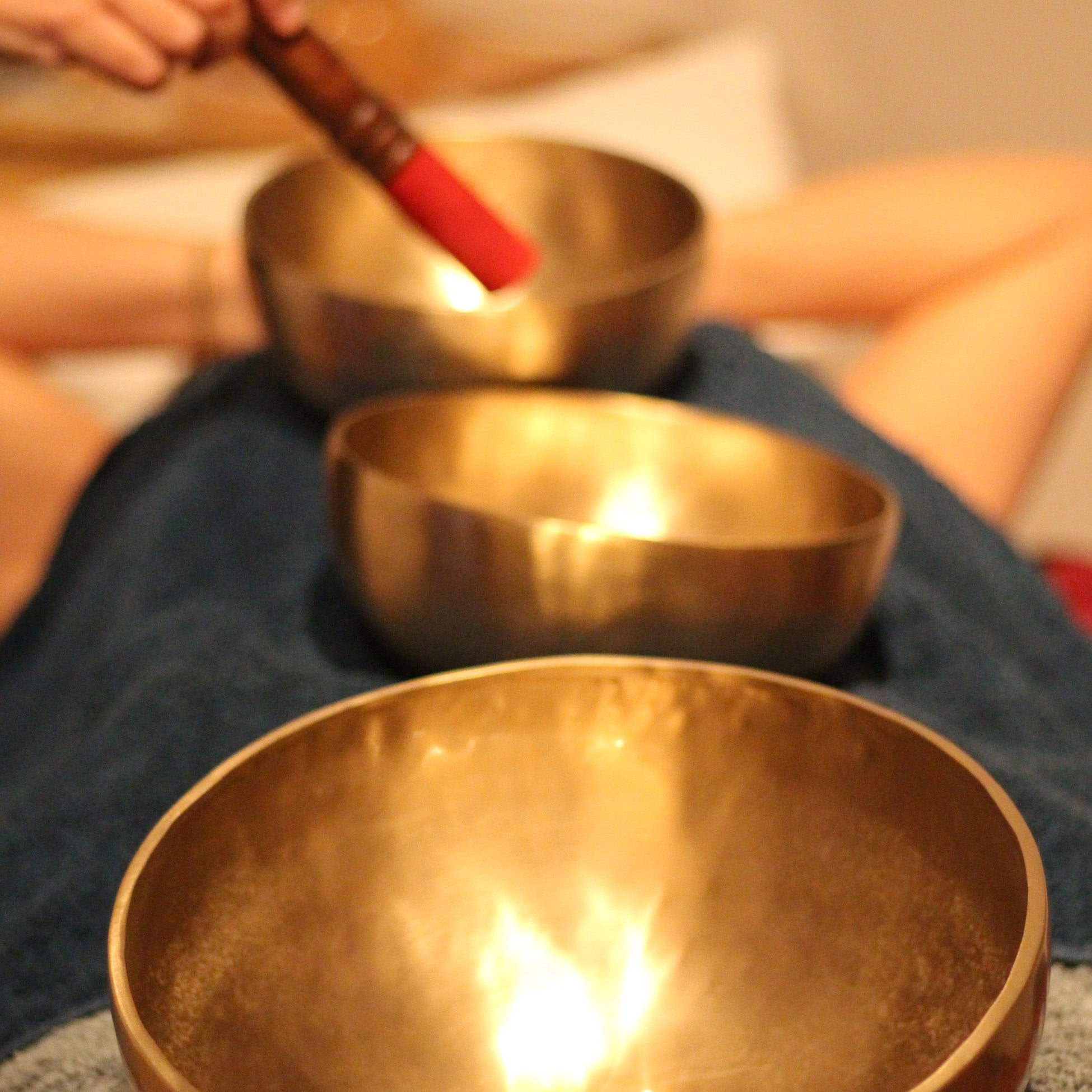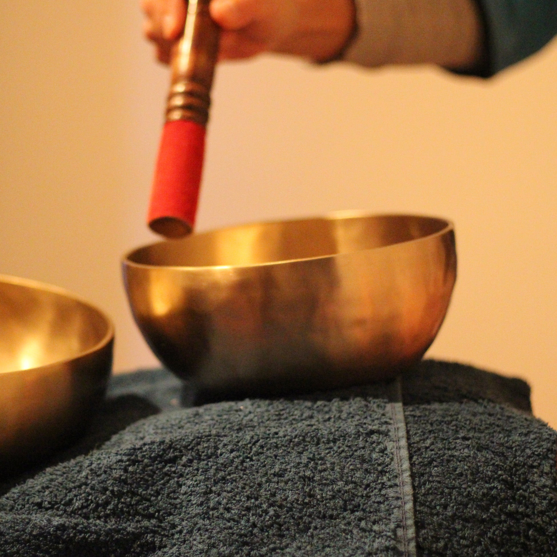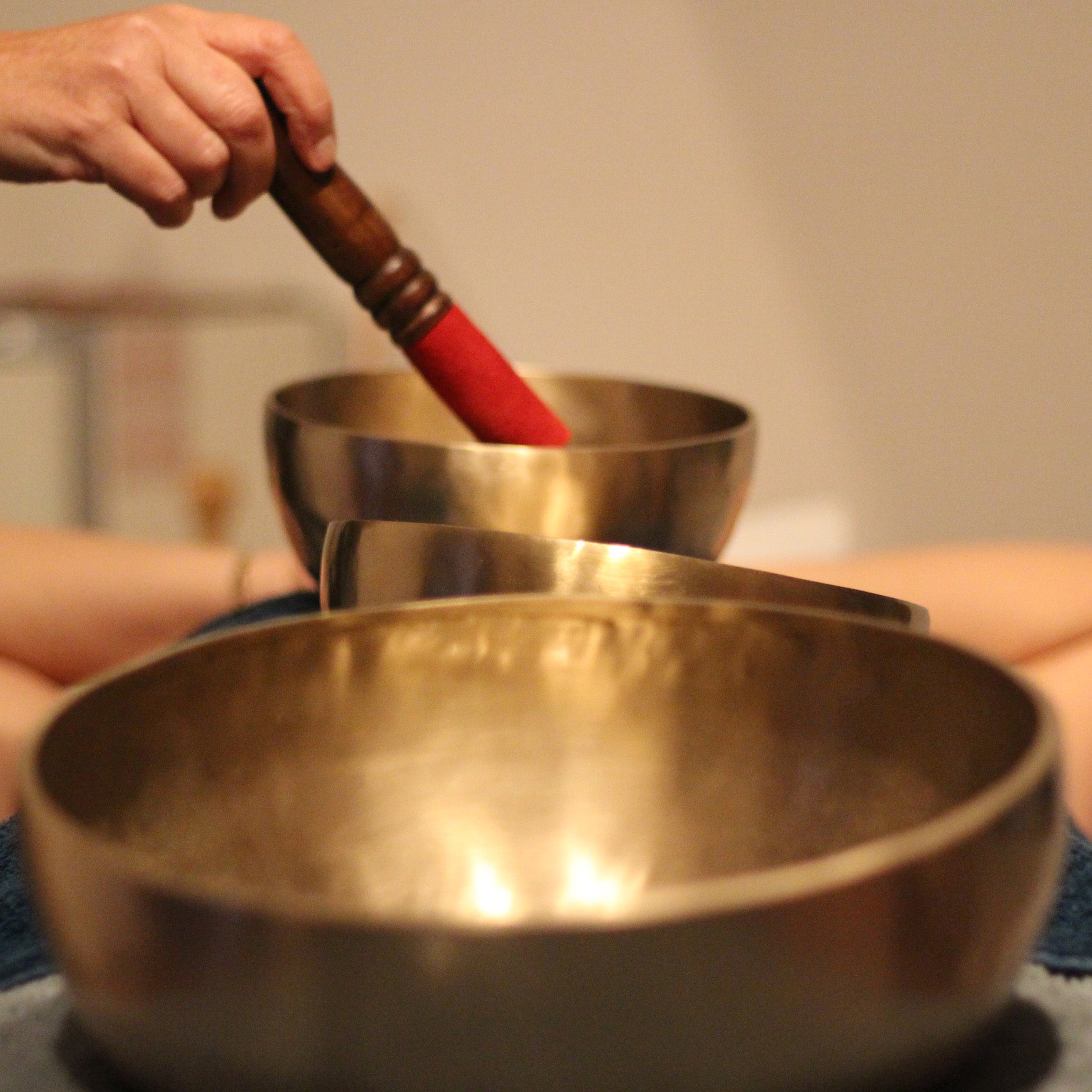 Lors d’un massage sonore aux bols tibétains, les bols sont délicatement frappés à l’aide de maillets en bois, en feutre ou parfois en cuir, afin de produire des sonorités et des vibrations harmonieuses.